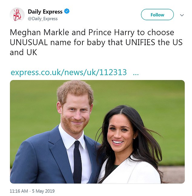 في هذه الأثناء، بدأت التكهنات حول ما سيختاره الزوج الملكي، بعدما صرَّح مصدر لشبكة CBS أن الزوجين من المرجح أن ينتقيا اسمًا يناسب الثقافة الأمريكية والبريطانية، ويبدو أن رواد مواقع التواصل الاجتماعي تعدوا الحدود باختيار أسماء غريبة وطريفة بإمكانها تقريب الفجوة بين البلدين.