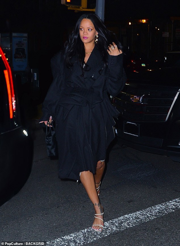 ورصدت عدسات الكاميرا ريهانا، وهي تغادر المكان بينما كانت تومض بساقيها الرفيعتين، حيث كانت ترتدي معطفاً أسوداً فوق فستانها يليق بمظهرها الأنيق، ونسّقت معه صندلاً أبيضاً مفتوحاً، وحقيبة يد مطابق لونها للمعطف، بالإضافة إلى شعرها المنسدل نحو أكتافها، وحاولت كسر اللون الأسود بأحمر شفاه ورديّ، وبعض الاكسسوارات الفضية.