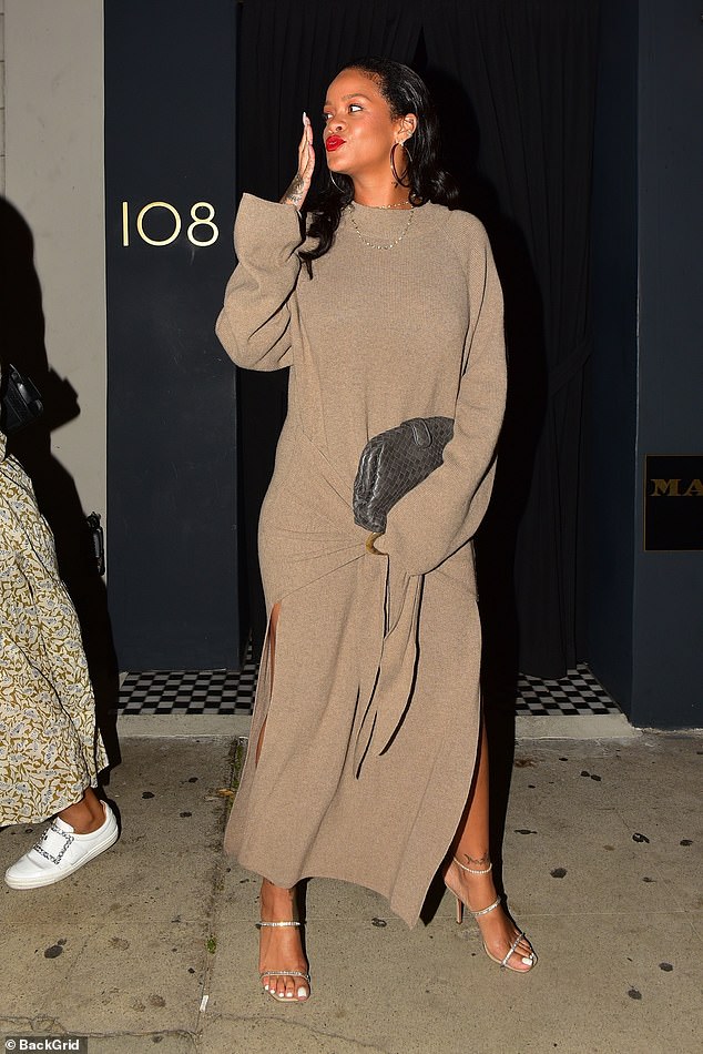 وظهرت ريهانا بإطلالة متألقة، وهي ترتدي فستاناً من الصوف الناعم تزيّن بشق طويل اختارته من مجموعة Nanushka، ووصل سعره إلى 335 جنيه أسترليني، كما تناسب لونه البيج مع بشرتها السمراء اللامعة.