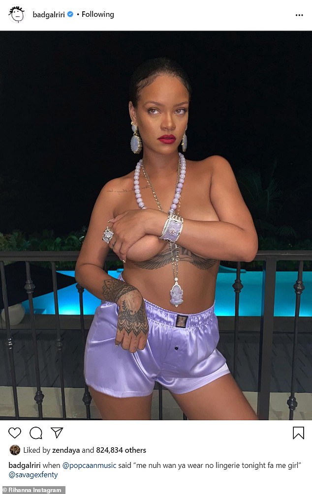 وعلّقت النجمة البالغة من 32 عاماً على الصورة بقولها: "عندما قالت المغني popcaan أنا لا أريد ارتداء الملابس الداخلية الليلة يافتاة"، في إشارة منها إلى المغنية الجامايكية Popcaan.