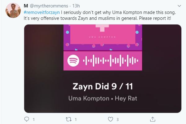 نشر مستخدم يحمل اسم Uma Kompton أغنية على تطبيق الأغاني "سبوتفاي" يتهم فيها النجم الإنجليزي ذي الأصول الباكستانية "زين مالك" بأنه وراء هجمات 11 سبتمبر التي وقعت عام 2001 في مدينة نيويورك، حينما ارتطمت طائرة بعمارتي مركز التجارة العالمي التوأم والبنتاغون.