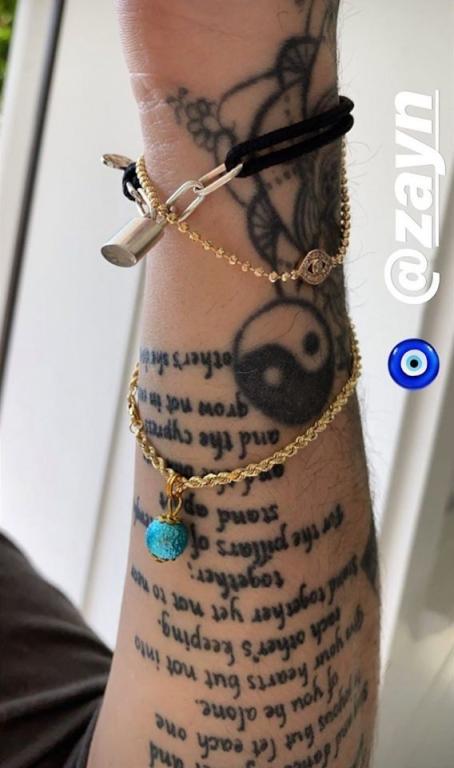كل وشم يحمل معنى ودلالة بالنسبة لـ"زين مالك"، وقد لاحظ رواد مواقع التواصل الاجتماعي وشمًا جديدًاعلى ئراعه مأخوذاً من قصيدة "الحب والزواج" للشاعر والأديب اللبناني العالمي الراحل "جبران خليل جبران"، فقد نشر صائغ المجوهرات "جورج خليفة" صورة ليد "زين" مُرتديًا أحد مجوهراته وبذلك برزت كلمات القصيدة.