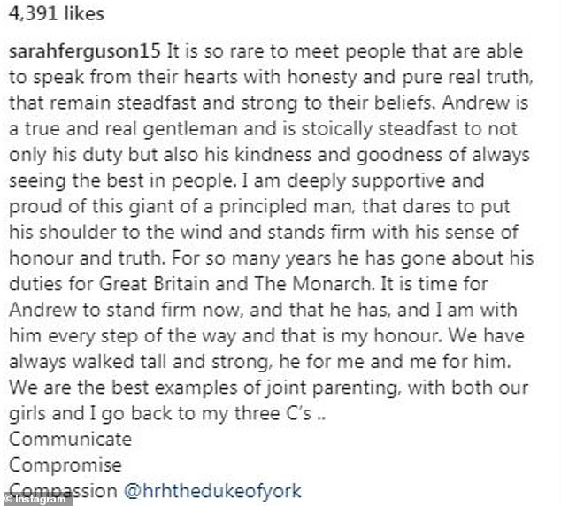 وخلال وقت سابق من المقابلة نشرت سارة فيرغسون مقالاً عاطفياً عبر حسابها الخاص على انستغرام دافعت فيه عن زوجها السابق الأمير أندرو مشيدةً بأنه رجل حقيقي وصادق وجريء كما أنه يقف بحزم في مهب الريح.