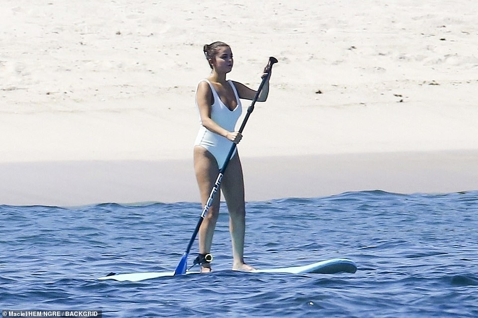 وبدت سيلينا رائعة ومثيرة بالمايوه الأبيض المكوّن من قطعة واحدة، والذي يتميز بياقته المنخفضة، كما اعتمدت تسريحة الكعكة لشعرها المبتل.
