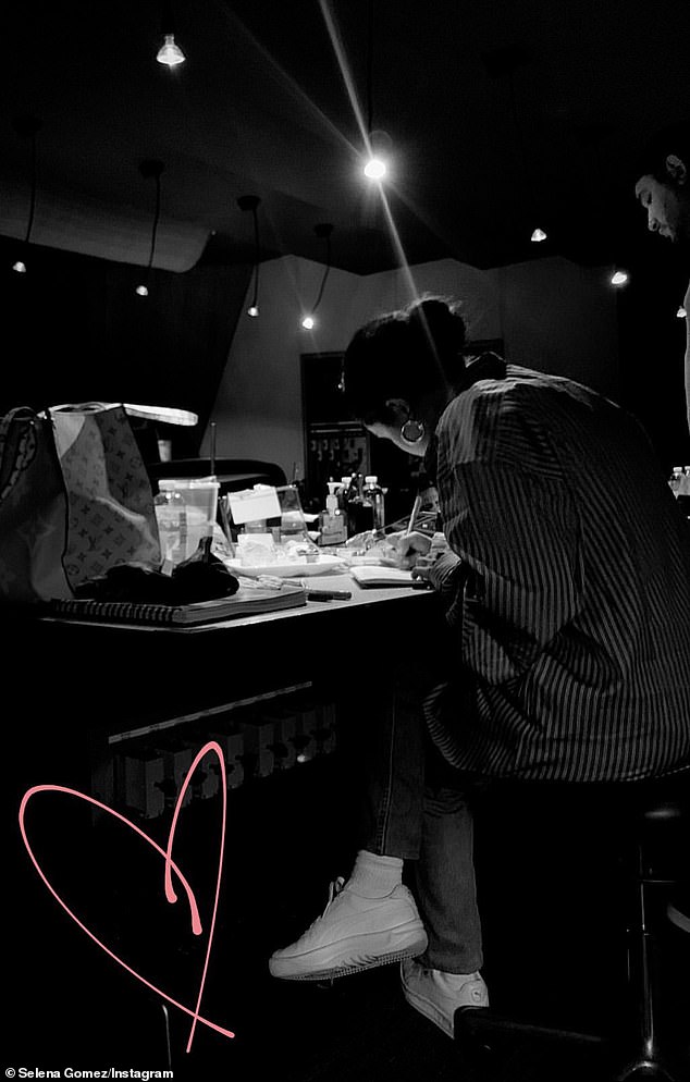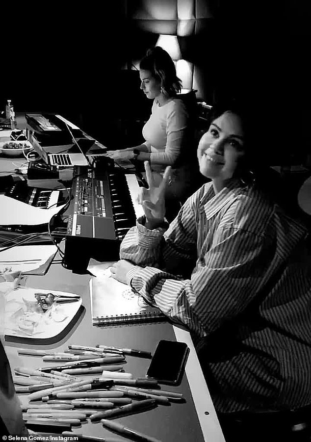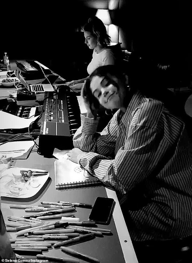 شاركت "سيلينا غوميز" متابعيها عبر موقع "إنستغرام" سلسلة من الصور باللونين الأسود والأبيض التقطت أثناء تواجدها في استديو التسجيل يوم الخميس الماضي، تظهر في إحداها مُتكئة على طاولة المعدات مُغمضة العينين، في حين ارتدت قميصًا فضفاضًا مخطط طوليًا، ويحيطها مجموعة من أقلام التلوين ودفتر للرسم.