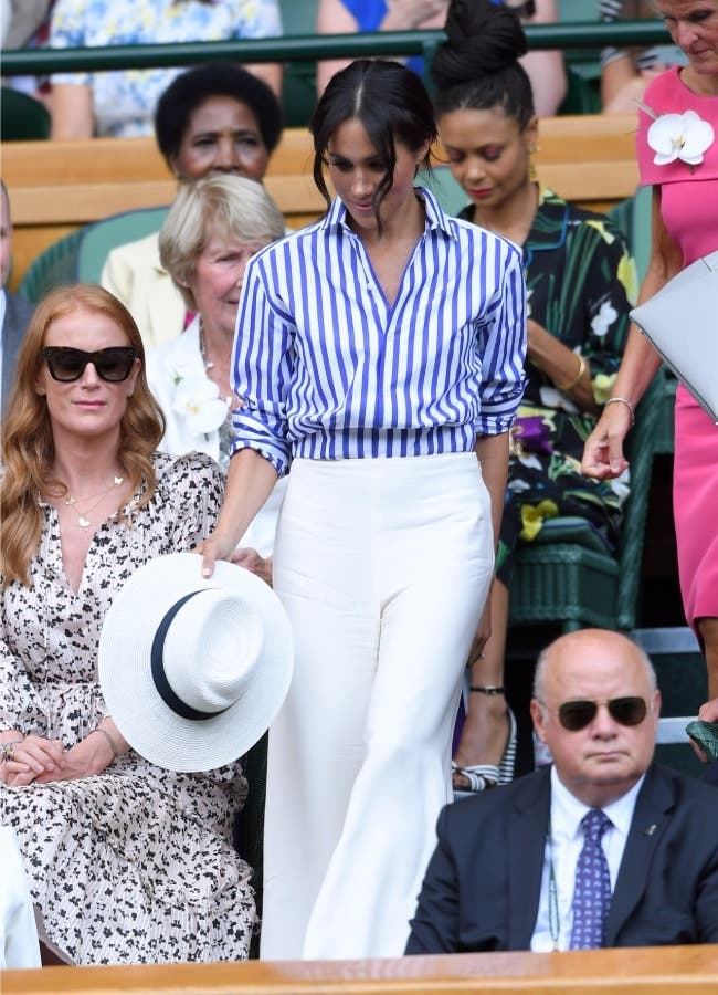 تواجد أفراد العائلة المالكة البريطانية في ويمبلدون لحضور إحدى المباريات، وتألقت الحسناء بإطلالة أنيفة كاجوال مُرتدية بنطال عريض ذي خصر عالٍ وقميص مخطط باللونين الأزرق والأبيض.