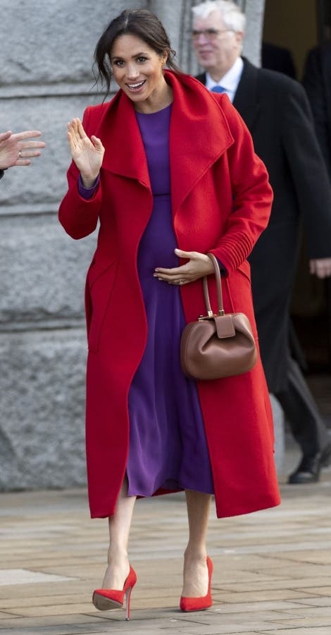 استمرت الدوقة في ارتداء الألوان الزاهية طيلة فترة حملها، وهذه إحدى الصور المفضلة لدينا حينما جمعت اللون الأحمر والأرجواني.