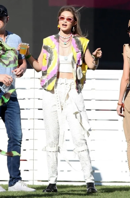 اعتمدت جيجي اطلالة عصرية لافتة تألفت من كروب توب وبنطلون باللون الأبيض، بينما أكملت اطلالتها بفيست ذي نقشة التاي داي، بالإضافة إلى بوت أسود مستوحى من التصميم الرجالي، كما لفتت جيجي الأنظار باكسسوارها ونظارتها الذين تميزوا بالألوان الربيعية، بينما تركت خصلاتها حرة.