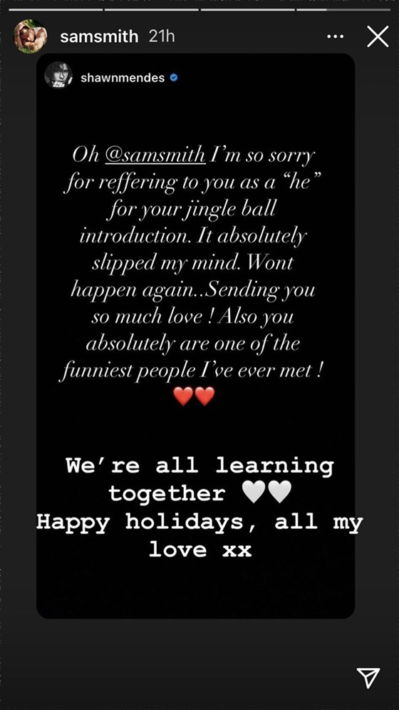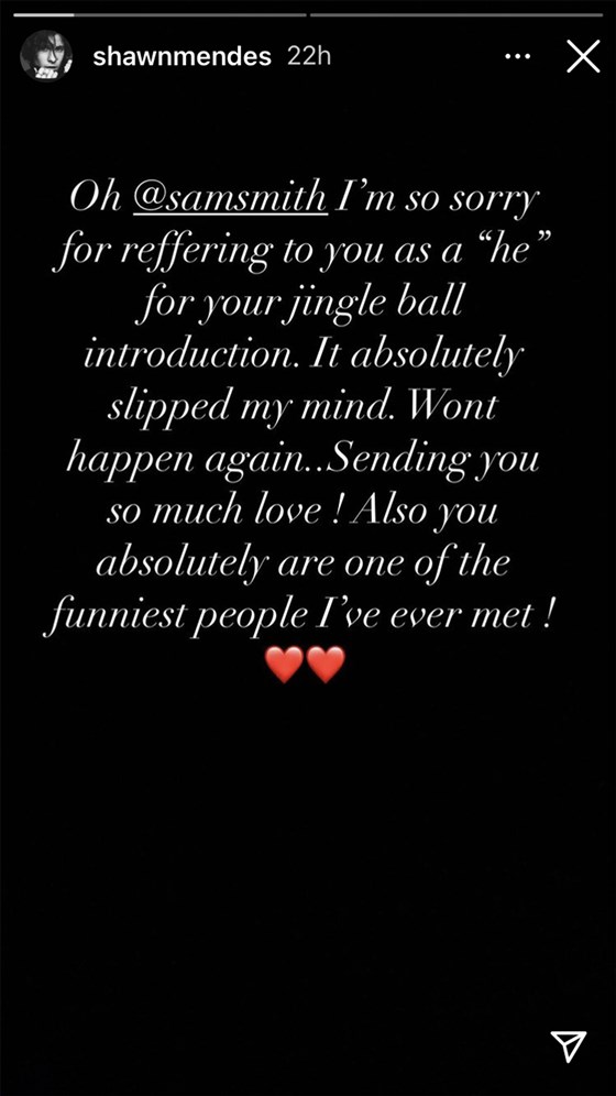 وكتب "مينديز" عبر خاصية "إنستغرام ستوري" يوم الجمعة: "سام سميث، اعتذر جدًا للإشارة إليك بمضير "هو" حين تقديمه في حفل Jingle Ball، لقد نسيت ذلك تمامًا، لن أكرر هذا مرة أخرى. "