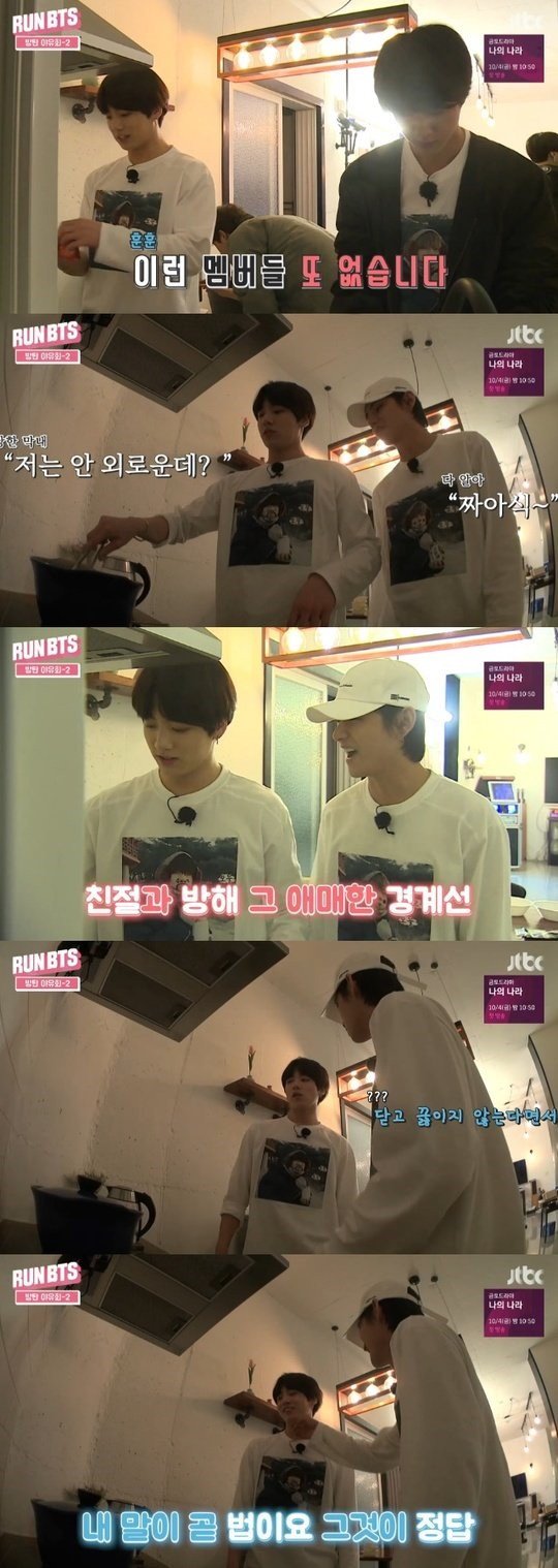 بعدها بلحظات، دخل المغني " كيم تاي هيونغ "، الملقب بـ"في"، المطبخ ووقف إلى جانب صديقه، وقال: "أتيت هنا لأني شعرت بأنك تحس بالوحدة"، ليجيب "جانغكوك" على الفور "لا أشعر بالملل على الإطلاق"، ثم أكمل عملية الطبخ مُشيرًا إلى خطوة مهمة أثناء طبخ الرامن، إذ أوضح أنه لا يغلق الطنجرة بالغطاء أثناء الغلي.