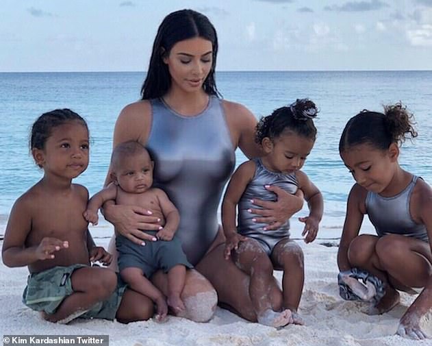 ويبدو أن كيم لم تحظََ بإجازة لوحدها، بل اصطحبت عائلتها معها إلى هناك، حيث التقطت صورةً لها وهي مع أطفالها الأربعة على الشاطىء، بينما كانت ترتدي مايوه سباحة ميتاليك، فضي اللون.