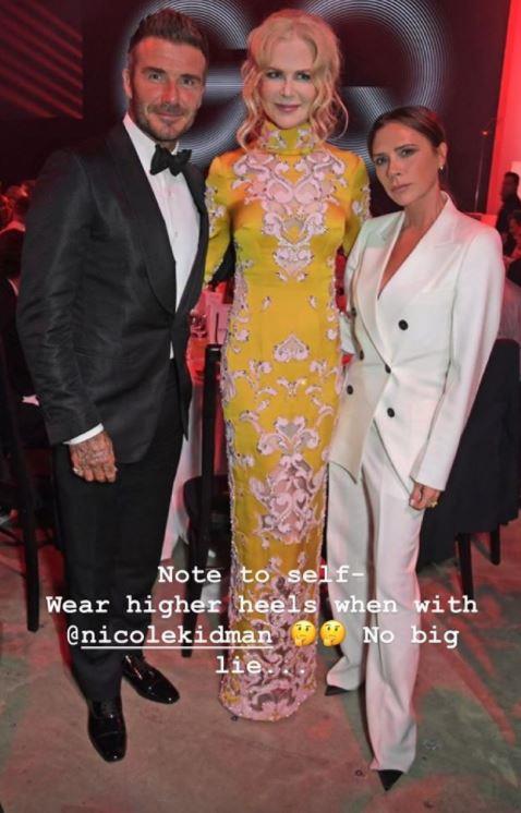 نشرت مجلة "هاربر بازار"، أن فيكتوريا بيكهام بعد لقائها وتحدثها مع نيكول وهي ثانِي أطول امرأة تفوز بجائزة الأوسكار، نشرت صورة تجمعها بزوجها وتتوسطهم نيكول كيدمان في حفل مجلة GQ لتوزيع جوائز رجل العام في لندن وكتبت عليها ارتداء الكعب العالِ بجانب نيكول ما هو إلا كذبة كبيرة، ساخرة من طول النجمة واستخدمت تعليق كذبة كبيرة نسبةً لمسلسل نيكول الجديد وأنها بدت قصيرة القامة بجانبها في الصورة.