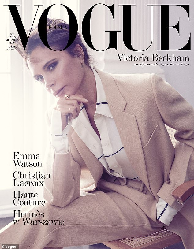 تألَّقت "بيكهام" على غلاف المجلة بعدة إطلالات أنيقة ذات طابع رجولي، فاختارت ارتداء البدلات الرجالية بألوان مُتعددة، من بينها بدلة مخملية زرقاء.