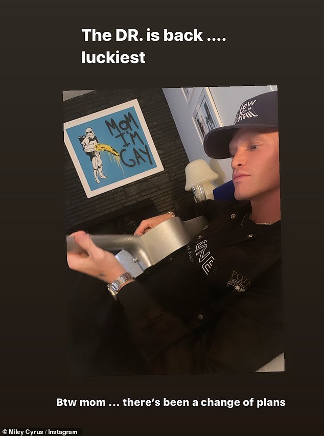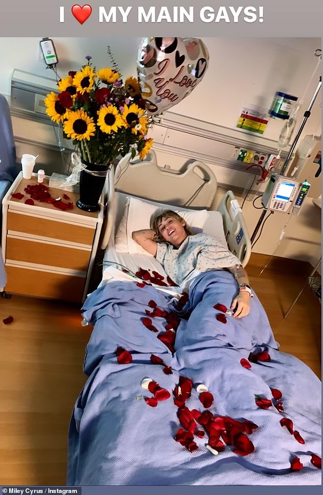 وكان من بين الزوار والدتها "تريش سايرس" و "كودي سيمبسون" الذي بدأت مواعدته بعد انفصالها عن زوجها "ليام هيمسورث"، حيث نشرت صورة لها مُستلقية على سرير المشفى تغطيها بتلات الورود الحمراء وإلى جانبها بالون كبير على شكل قلب كُتب عليه "أحبك".
