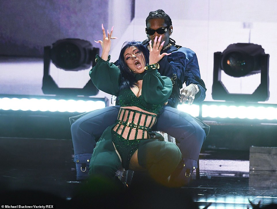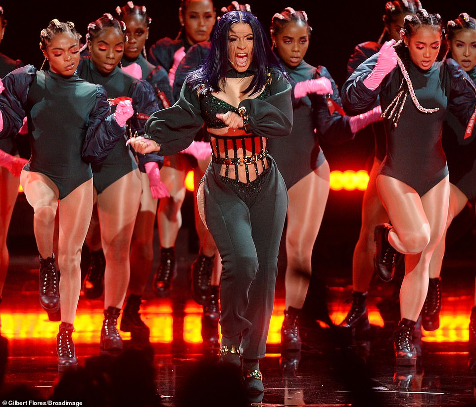 وقد افتتحت المغنية العالمية الحفل بأداء مُثير على خشبة المسرح برفقة الراقصين المساعدين، كما أدَّت رقصة تعري في أحضان زوجها مغني الراب "أوفست"، واستعرضت جسدها بملابس جريئة خضراء.
