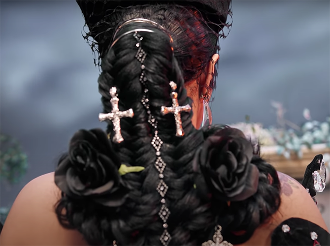 في إحدى تسريحاتها، اعتمدت "كاردي" تسريحة شعر الجديلة التي تزيَّنت بصليبين مرصعان بالألماس، وبعض الأحجار الكريستالية، بالإضافة إلى ورود سوداء، وكلما حدَّقنا أكثر سنلاحظ المزيد من التفاصيل.