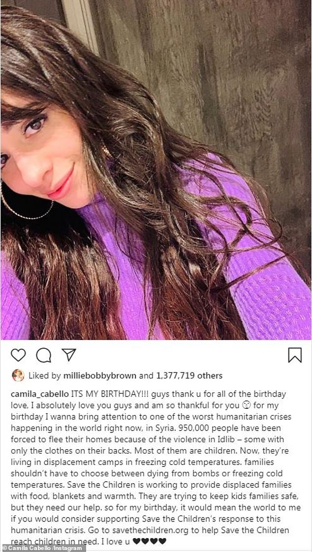 بعد نشر صورة سيلفي وشكر محبيها على تمنياتهم لها عيد ميلاد سعيد، استخدمت "كاميلا كابيو" شهرتها ومنصاتها عبر مواقع التواصل الاجتماعي لتسليط الضوء على واحدة من "أسوأ الأزمات الإنسانية" في العالم.