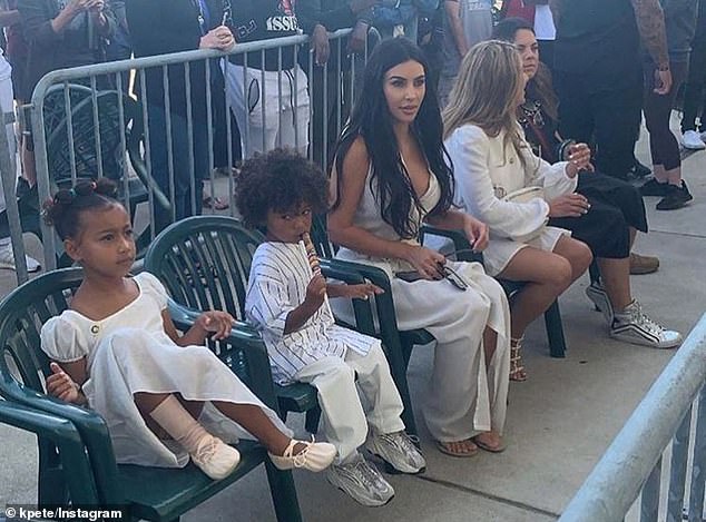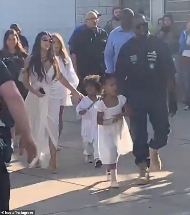 إلا أن كانيه لم يكن لوحده هناك فقد انضمت إليه زوجته كيم التي كانت ترتدي فستان أبيض شفاف، بالإضافة إلى طفلتيها نورث وسانت وهما بملابس مطابقة لوالدتهما.