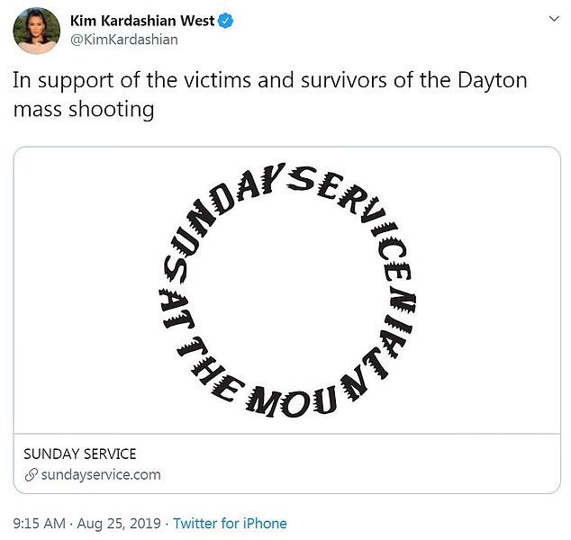 وغرّدت كيم قبل الحدث على تويتر قائلة: "لدعم الضحايا والناجين من إطلاق النار الجماعي في دايتون"، وأضافت رابط خدمة الاحد، حيث يمكن للمشاهدين مشاهدة البث على الهواء مباشرة.