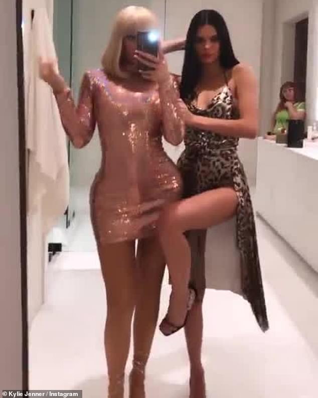وظهرت كايلي بإطلالة مثيرة، فارتدت فستانًا قصيرًا وردي اللون ولامعًا بأكمام طويلة، يبلغ طوله حد الفخذ، نسّقته مع شعر أشقر مستعار قصير، بالإضافة إلى أنها انتعلت حذاءً فضيًا لامعًا بكعب عريض.