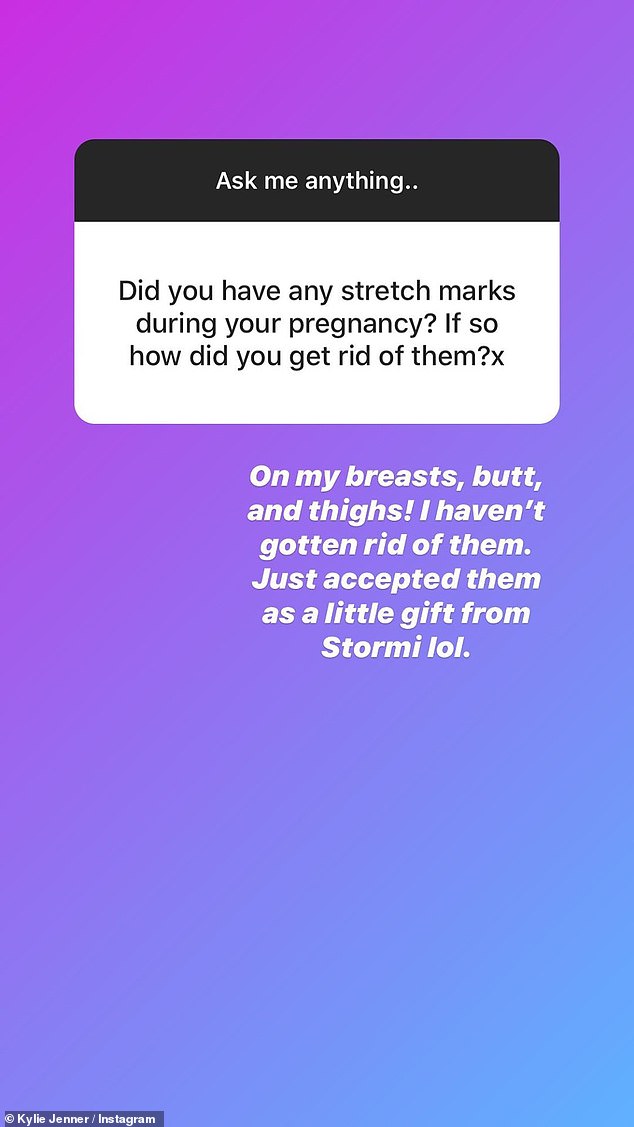 وعندما سألها أحد المتابعين هل بمقدورها العودة لشكل جسمها السابق قبل الولادة ردت: "لا أظن ذلك فيمكن أن يعود الجسم لرشاقته سريعا بعد الولادة، لكن هذه العلامات ستظل ترافقني ولم أستطع التخلص منها بالعلاجات المختلفة، واعتبرتها هدية من ستورمي وكفى شعرت بالأمومة، فكم هو احساس رائع، أن يتحرك طفل صغير وينمو بين أحشائك".