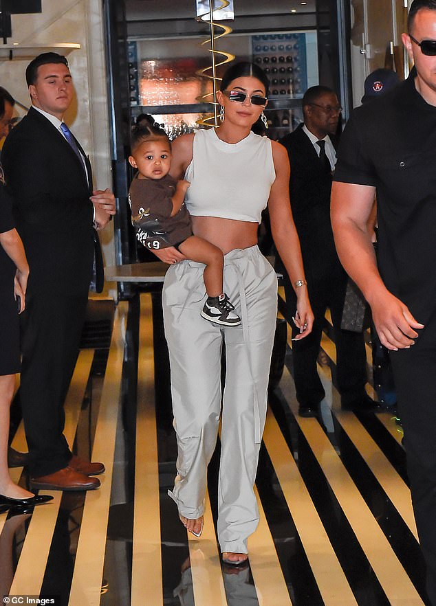 وشوهدت كايلي يوم الثلاثاء مع ابنتها ستورمي في نيويورك، حيث كانت ترتدي توب أبيض، مطابق للون البنطال عالي الخصر المزيّن بالحزام، كما نسّقت معه حذاء شفاف بكعبٍ عالٍ، ونظارة شمسية سوداء، بالإضافة إلى أنها اعتمدت تسريحة الكعكة المنخفضة، ووضعت أقراط السلسلة، أما ابنتها ستورمي فبدت كحبّة القهوة في قميصها البني، وحذائها الرياضي المطابق لونه للقميص.