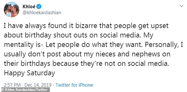 لكن خالتهم كلوي كارداشيان كانت أحد أفراد العائلة التي لم تقم بنشر أي تهنئة على انستغرام تكريماً لهما، مما جعلها تتعرض لرد فعل عنيف وهجوم حول امتناعها عن النشر.