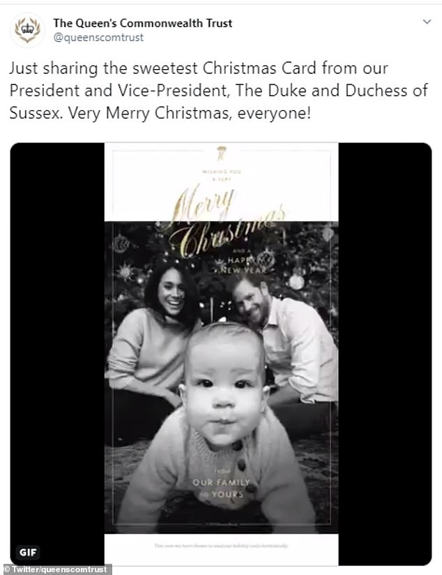 وفي وقت سابق، نشر دوقا ساسكس "ميغان ماركل" والأمير "هاري" بطاقة معايدة عائلية باللونين الأسود والأبيض عبر مواقع التواصل الاجتماعي، حيث يظهران جالسين أمام شجرة عيد الميلاد، بينما آرتشي يحبو بالقرب من الكاميرا.