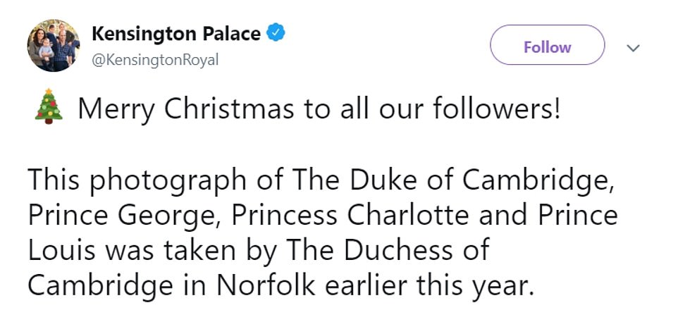 ونشرا تغريدة عبر حسابهما، جاء فيها: "عيد ميلاد سعيد لكل متابعينا.. هذه الصورة تجمع كل من دوق كامبريدج، الأمير جورج، الأميرة شارلوت، والأمير لويس، وقد التقطتها دوقة كامبريدج في نورفولك في وقت سابق من هذا العام".