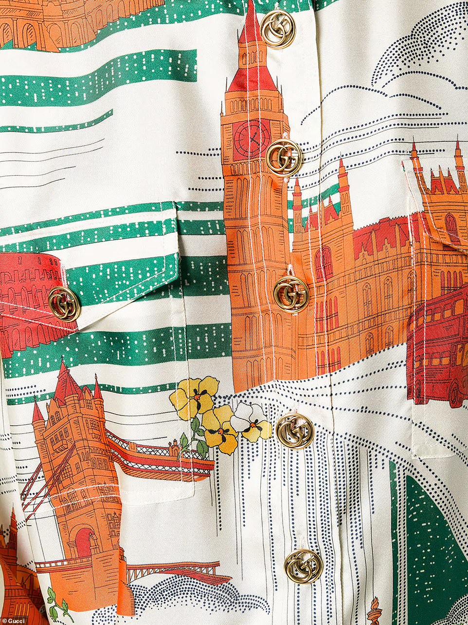 وارتدت ميلانيا فستانًا من اللون البيج، مزيّنًا بأزرار أمامية، وطبعت عليه صور لأشهر المعالم البريطانية باللون البرتقالي، كما توسطه حزام جلدي أخضر، ونسّقته مع حذاء بكعب عال.