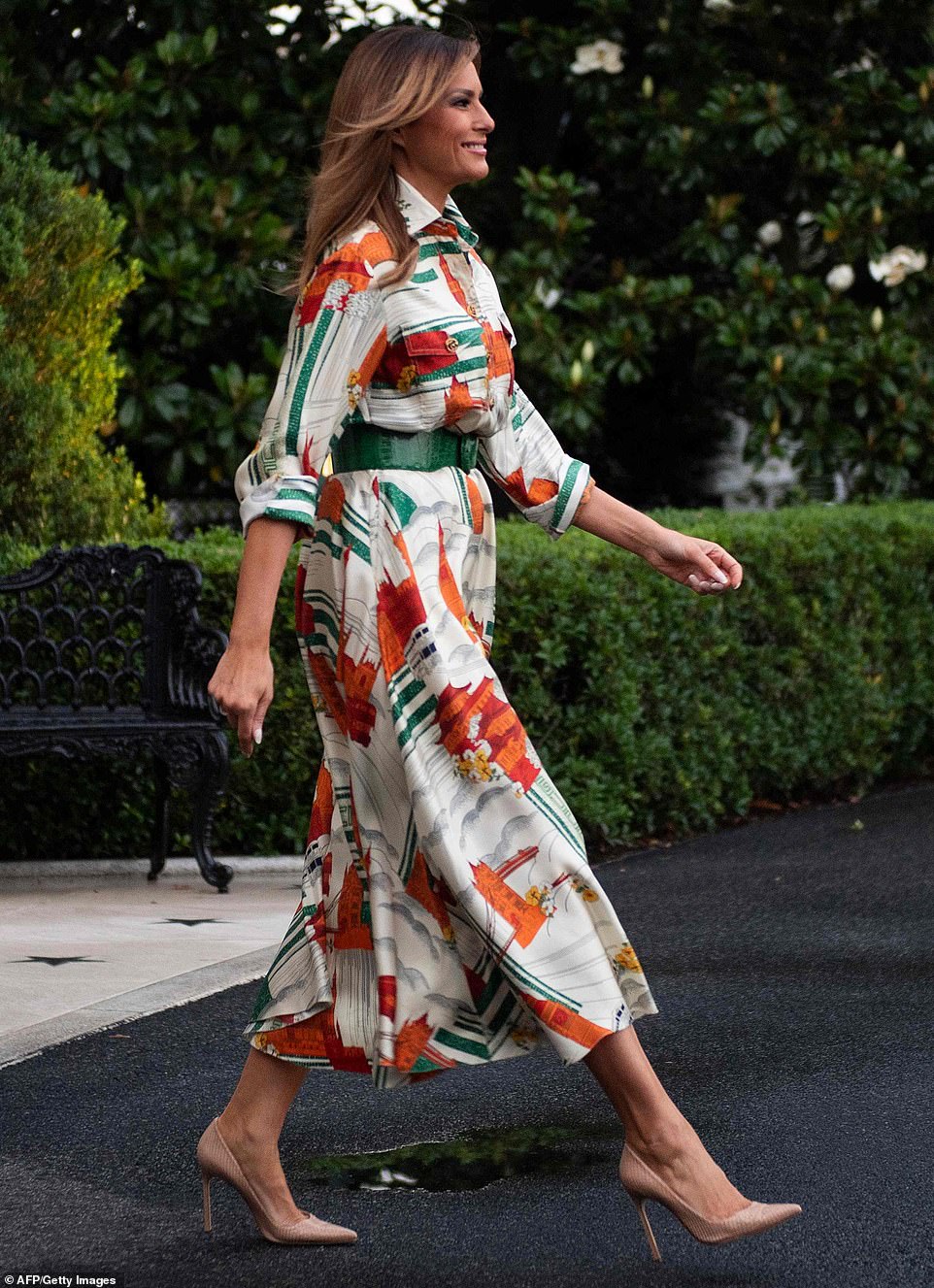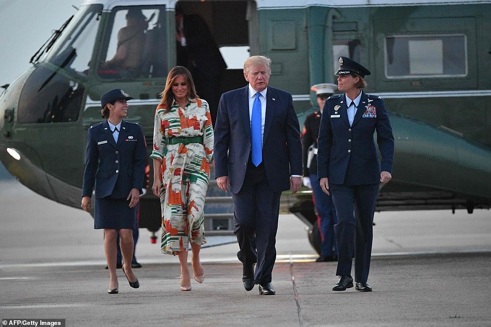 قامت ميلانيا بعرض فستانها الرائع من غوتشي والذي تبلغ تكلفته 4,400 دولار، وهي تستقل طائرة خاصة Air Force One في ولاية ماريلاند.