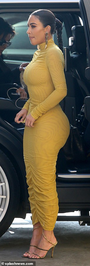 استعرضت "كيم" منحنيات جسدها المثير مُرتديةً فستان أصفر ضيِّق بأكمام طويلة وياقة عالية، وانتعلت صندل ذهبي، في حين اعتمدت تسريحة شعر على شكل جديلة طويلة، وأكملت إطلالتها المثيرة معتمدة مكياج من درجات الألوان الترابية وأحمر شفاه نود، في حين تزيَّنت بأقراط ذهبية طويلة.