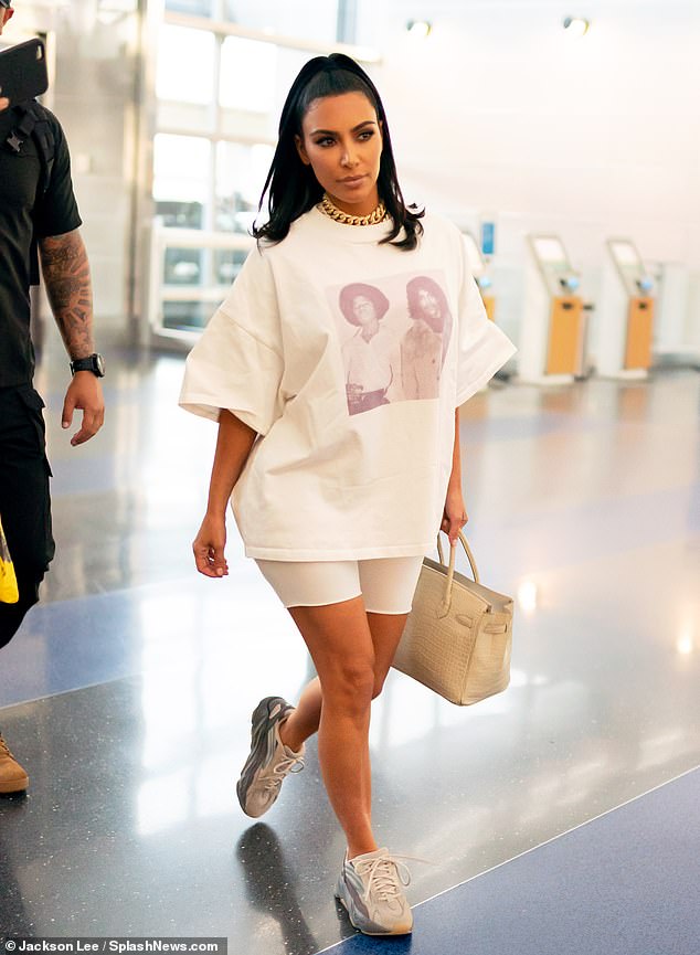 توجَّهت "كيم كارداشيان" إلى مطار جون كينيدي في مدينة نيويورك يوم أمس الثلاثاء، واختارت إطلالة كاجوال مُريحة مؤلَّفة من قميص فضفاض أبيض من العلامة التجارية ُEsty يبلغ سعره 21 دولار، طُبع عليه  صورة نجم البوب الراحل "مايكل جاكسون" وإلى جانبه النجم العالمي المُتوفى "برينس" في فترة شبابهما، ونسَّقته بشورت ليغينغ أبيض.