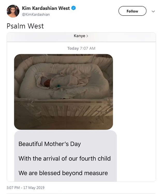 أخيرًا وبعد أكثر من شهر تقريبًا، قررت نجمة تلفزيون الواقع "كيم كارداشيان" مشاركة متابعيها عبر حساباتها على مواقع التواصل الاجتماعي صورة لطفلها الرابع الذي أنجبته بمساعدة أم بديلة في الـ9 من شهر مايو الماضي.