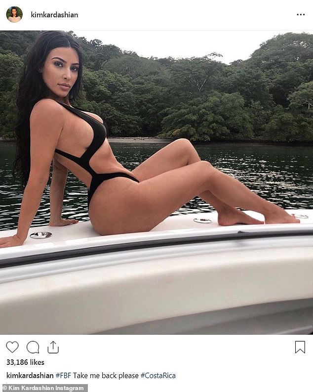 ونشرت كيم صورةً مثيرة لها، وهي ترتدي مايوه أسود، بالكاد ستر جزءًا من جسدها، إذ كان تألف من خيوط، وفي لقطة أخرى ظهرت بتوب أسود، نسّقته مع بكيني مطابق.