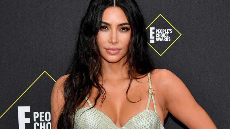 وظهرت "كيم" بإطلالة مذهلة بفستان من الجلد اللامع ونقشة النمر، كما كان الفستان بقصة الباكلس من الأعلى، ونسقت معه حذاء برباطات طويلة ورفعت شعرها الأسود.