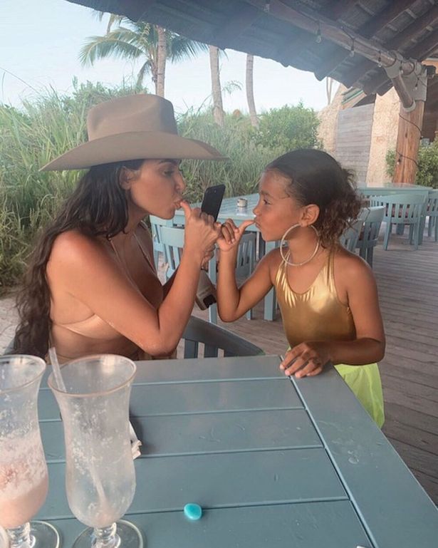 في الصورة، تُطل "كيم كارداشيان" مُرتديةً بكيني باللون اللحمي مؤلف من قطعتين واعتمرت قبعة رعاة بقر، في حين تشاركت هي وابنتها إشارة الصداقة، فتشابك بُنصرهما وقبَّلتا إبهامهما.