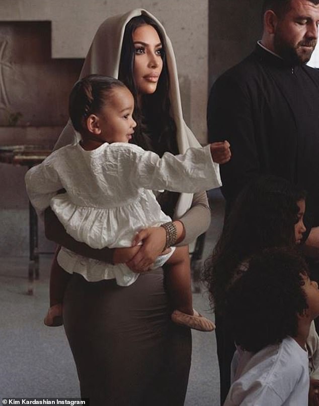 وارتدت كيم فستان باللون البيج ووضعت غطاءً على رأسها بينما كانت شيكاغو الصغيرة ترتدي فستاناً أبيض.