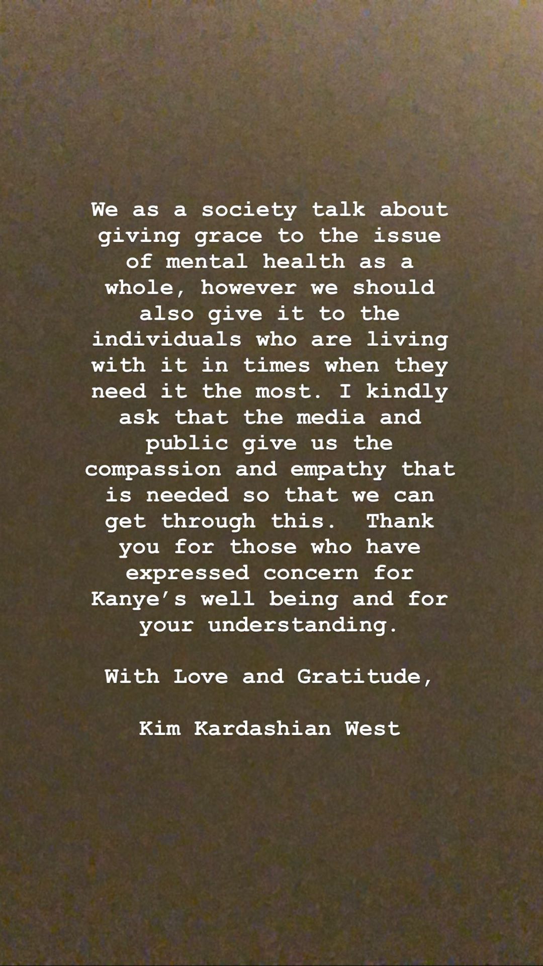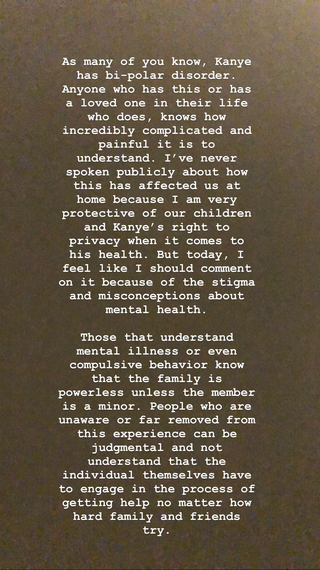وكتبت: "كما يعلم الكثير منكم، يعاني كانييه من اضطراب ثنائي القطب. أي شخص يعاني من هذا المرض أو لديه شخص مصاب به يدرك كيف يكون الأمر معقدًا ومؤلمًا بشكل لا يصدق.. لم أتحدث علانية حول كيف أن هذا المرض يؤثر علينا في العائلة لأني أحاول حماية أطفالي وحق كانييه في الخصوصية عندما يتعلق الأمر بصحته. لكن اليوم، أشعر أنني بحاجة للتعليق على الموضوع بسبب وصمة العار والمفاهيم الخاطئة التي تدور حول الصحة العقلية".