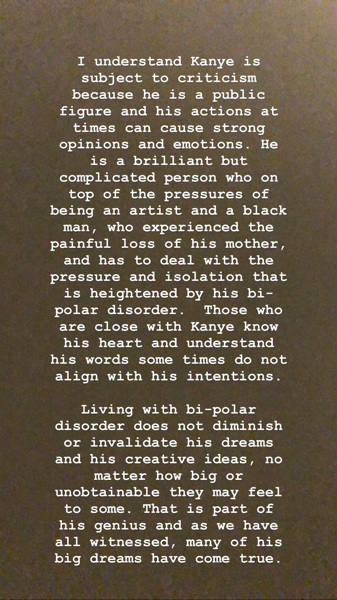 وتابعت قائلة: "أتفهم أن كانييه يتعرض للنقد لأنه شخصية عامة وقد تؤدي أفعاله في بعض الأحيان إلى آراء ومشاعر قوية. إنه شخص رائع لكنه معقد ويعاني من ضغوط باعتباره فنانًا ورجلًا أسود، بالإضافة لفقدان أمه بشكل مؤلم، وعليه أن يتعامل مع الضغط والعزلة التي يزيدها اضطرابه ثنائي القطب."