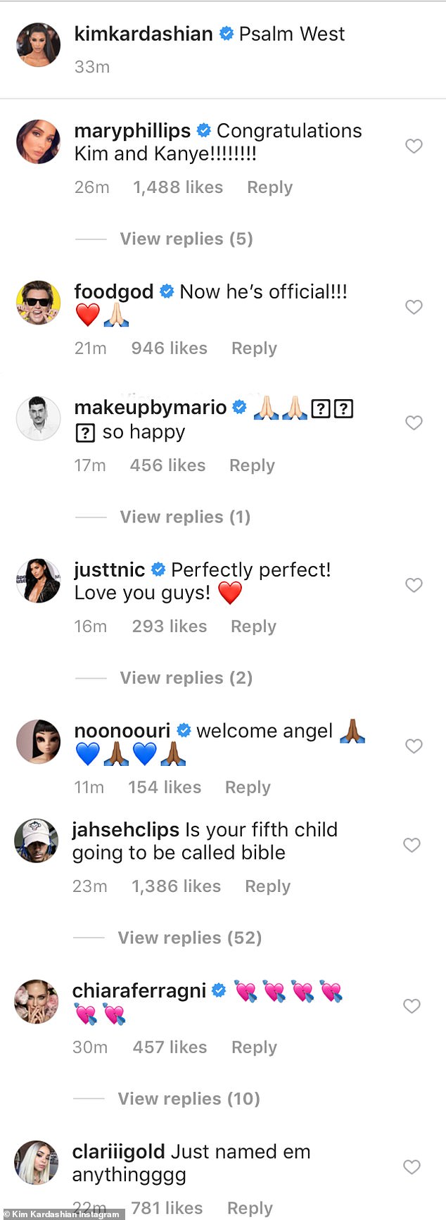 ونشرت كيم لقطة من محادثة نصيّة بينها وبين زوجها كانيه ويست، حيث كانت الرسالة تتضمن صورة الطفل، بالإضافة إلى تهنئة بعيد الأم.