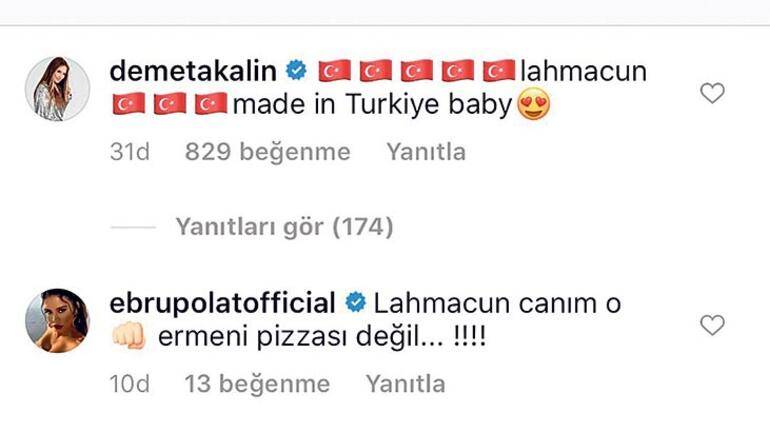 ولم تتمكن النجمات التركيات من الوقوف بصمت، بل قررت التركية "ديميت اكالي" دخول الحرب ونشرت عبر حسابها على "إنستغرام" منشورًا كتبت فيه: "اللحم بعجين صنع في تركيا عزيزتي"، بالإضافة إلى المغنية "ايبرو بولات" التي كتبت: "لحم بعجين وليس بيتزا ارمنية".