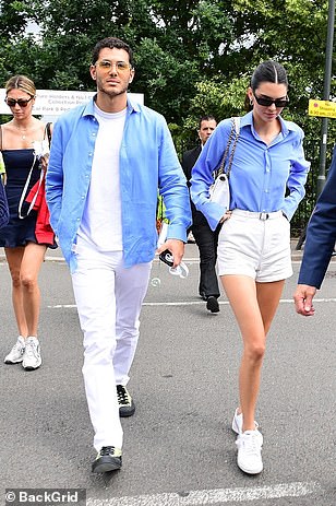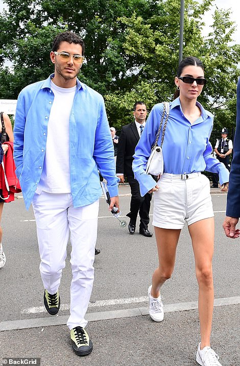 وظهرت كيندال بشورت أبيض، بخصر عال، مع قميص أزرق، ونسّقت معه حذاءً رياضيًا أبيض مطابقًا لحقيبة اليد، كما اعتمدت تسريحة ذيل الحصان.