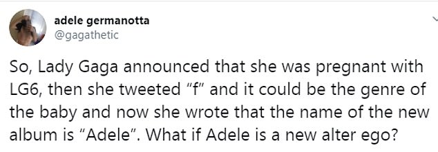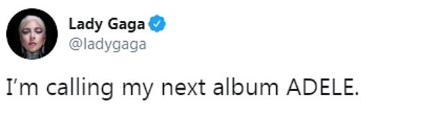 أثارت "ليدي غاغا" (33 عامًا) فضول متابعيها وحيرتهم بنشرها تغريدة عبر حسابها على موقع "تويتر" تكشف من خلالها عن اسم ألبومها الجديد المستوحى من إحدى النجمات البريطانيات العالميات، فكتبت: "سأطلق على ألبومي القادم اسم "أديل"."