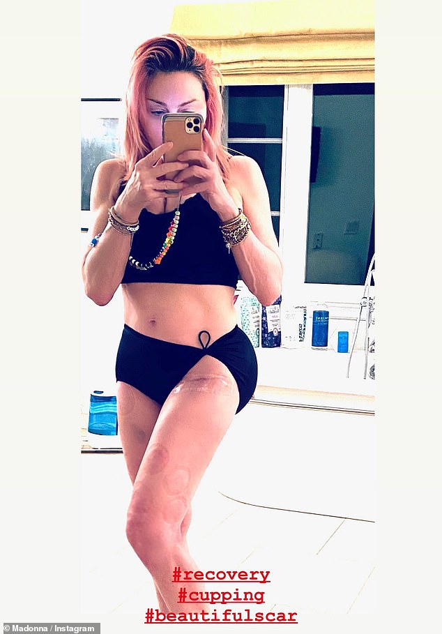 وفي مشاركتها الأخيرة عبر موقع "إنستغرام"، أكَّدت "مادونا" (62 عامًا) أنها تحاول التعافي وتلقي العلاج المناسب لمشاكلها الصحية خلال هذه الفترة، ونشرت صورة سيلفي لها أمام المرآة مرتديةً ملابسها الداخلية كاشفةً آثار عمليتها الجراحية التي أجرتها في فخدها، بالإضافة إلى علامات الحجامة المنتشرة على امتداد ساقيها.