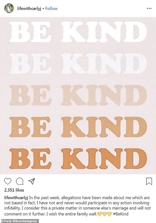 وكتبت "كارلي" عبر إنستغرام ليلة الاثنين: "في الأسبوع الماضي، صدرت ادعاءات عني لا تمت للواقع بصلة، فأنا لم ولن أشارك في أي عمل ينطوي على الخيانة الزوجية، وأنا أعتبر هذه مسألة خاصة في زواج شخص آخر ولن أعلق عليها أكثر. أتمنى كل خير للعائلة بأكملها"، مضيفة إشارة تقول فيها "كوني لطيفة".