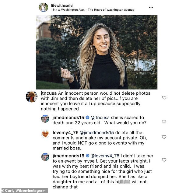 ومن ثم تدخل جيم للدفاع عن كارلي في التعليقات وقال: "أنا لم أخرج معها وحدي، بل كنا مع صديقي المقرب وطفليه، فقد كنت أحاول القيام بمبادرة لطيفة للفتاة بعد أن انفصلت عن صديقها". وختم: "أنا اعتبرها كابنة لي، ولن يغير كل هذا الهراء من ذلك".