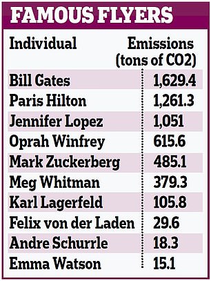 أما الملياردير بيل غيتس مالك شركة مايكروسوفت فقد تصدّر القائمة بترك أثر ما يقارب 1600 طن من ثاني أكسيد الكربون من خلال قيامه بـ59 رحلة عام 2017 وقطع مسافة 213,130 ميل معظمها على متن طائرته الخاصة، إلا أن بيل له العديد من المقالات والمحاضرات حول الاحتباس الحراري واستخدام وسائل النقل التي تزيد من هذه المشكلة.