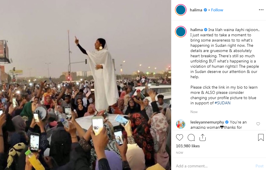 وأرفقت منشورها بتعليق، جاء فيه: "الجميع يجب أن يسمعوا هذا، لقد تم حجب الإنترنت في السودان، وذلك ضمن الجهود المبذولة لحجب هذه المعلومات الحيوية والقاسية عن بقية العالم، إن قلبي متأثر للغاية بمجرد تفكيري في أحوال الرجال والنساء الذين يعيشون في السودان، فهم يتعرضون للضرب والقتل والاغتصاب والقمع".
