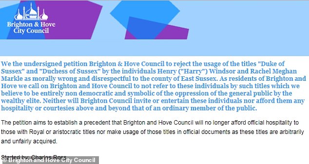 وبالرغم من ذلك سيناقش مستشارو برايتون تجريد هاري وميغان من ألقابهما دوقا ساسكس وذلك بعد أن وقّع الالآف على عريضة.